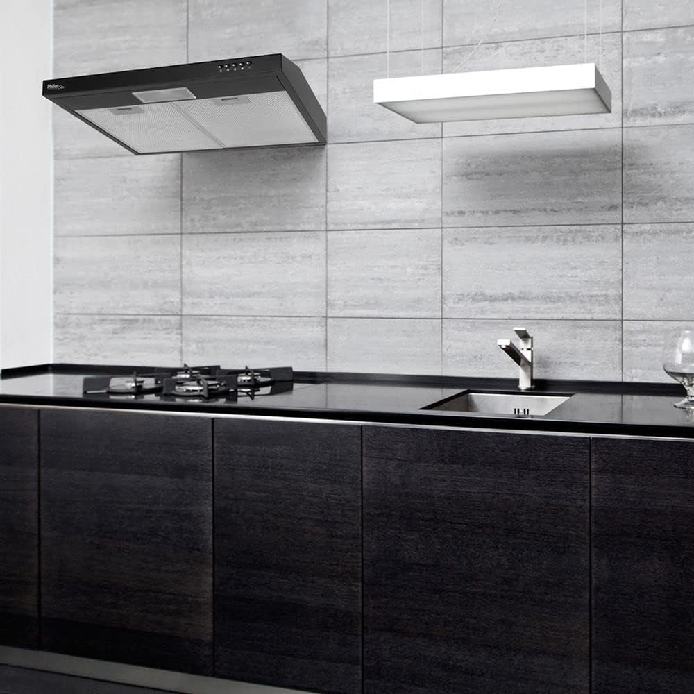 - Funções: 3 níveis de velocidade, iluminação LED, filtro metálico + carvão.